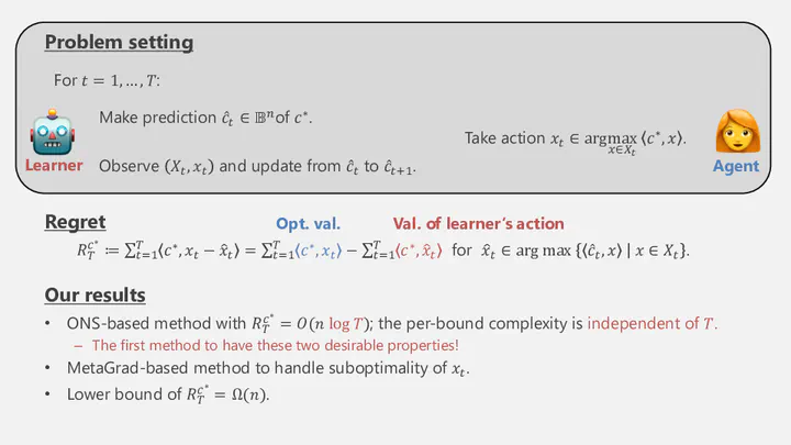 Their idea is novel and somewhat different from the online-learning approach, which I briefly describe here. Intuitively, the feedback $(x_t, X_t)$ is informative compared to that in general OLO; the optimality of $x_t \in X_t$ narrows down the possible existence of $c^*$ to the normal cone of $X_t$ at $x_t$ (or loosely, the half-space normal to $x_t - \hat x_t$). Their methods implement this idea by sequentially updating a region that is ensured to contain $c^*$. Based on the volume argument commonly used in the analysis of the ellipsoid method, they established logarithmic regret bounds. However, the per-round time complexity is polynomial in $n$ and $T$, as their methods need to maintain the region specified by up to $T$ observations.
